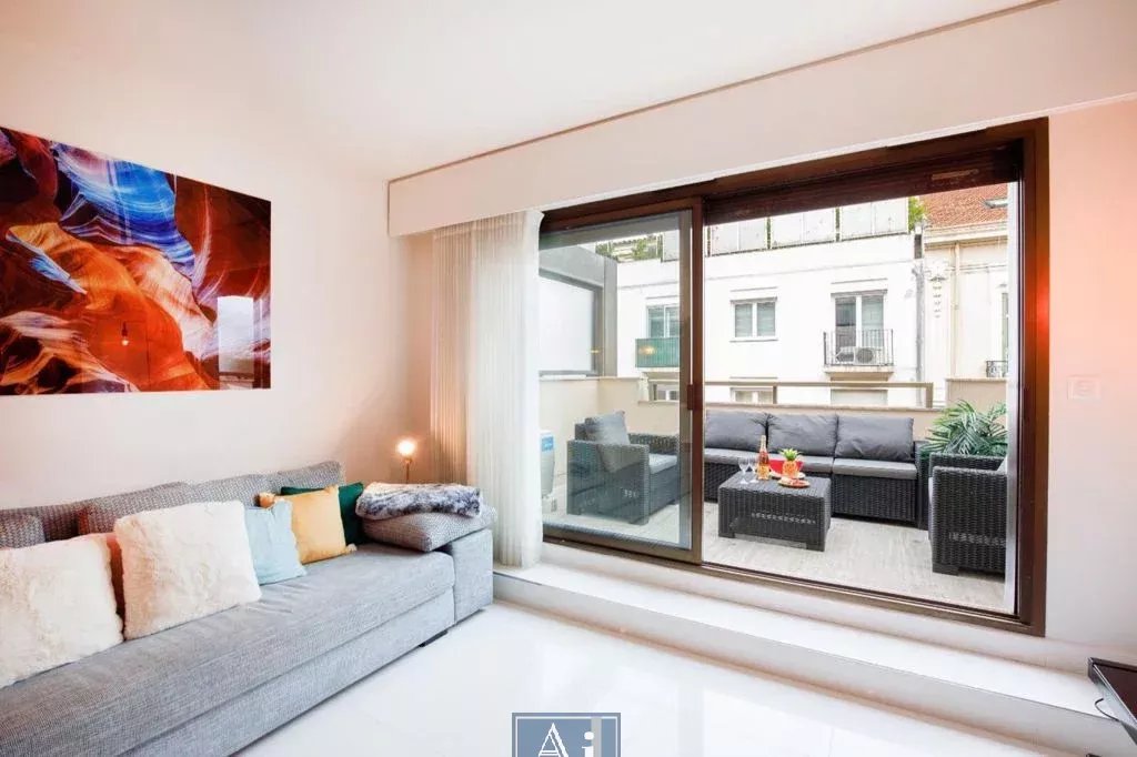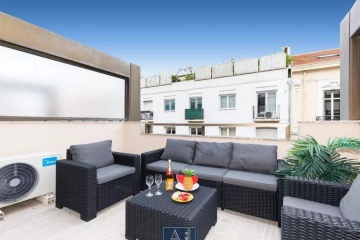 Cannes Gray d'Albion Residence. On the 5th floor with lift. Very nice apartment with terrace. Entrance, living room open on the terrace, open equiped kitchen, bedroom with double bed, bathroom with shower and toilets. A/C. Wifi.