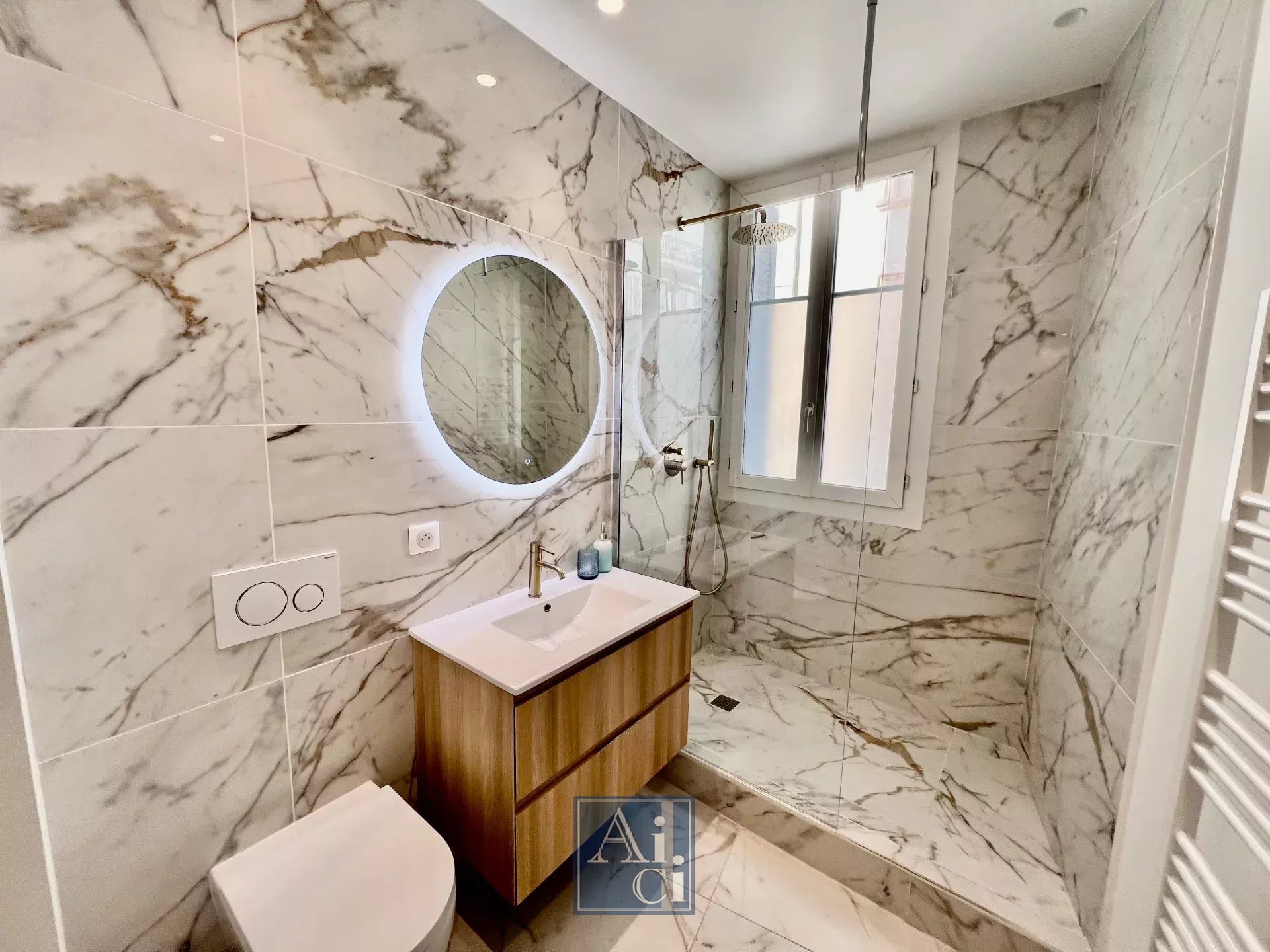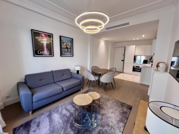 Cannes Banane, rue du Commandant André à 50m des plages de La Croisette, au cœur du Carré d'Or avec ses boutiques et restaurants. Dans un immeuble bourgeois avec ascenseur. Beau 2 pièces neuf, offrant une vue latérale sur la mer. Entrée avec toilettes indépendants, séjour avec canapé convertible, cuisine américaine entièrement équipée, chambre avec lit double, salle de douche à l'italienne. Climatisation. Wifi