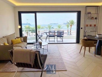 Cannes Croisette à 200m du Palais des Festivals. Entrée avec toilettes invités, salon ouvrant sur terrasse vue mer, cuisine américaine entièrement équipée, 2 chambres avec 2 salles de douche en suite. Climatisation. Wifi.