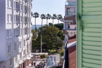 Cannes Banane, emplacement de 1er ordre à 50m du Palais des Festivals et du Majestic. En dernier étage, très bel appartement de 2 pièces type loft en parfait état. Séjour cathédral avec canapé convertible, ouvrant sur large terrasse fermée en loggia, cuisine américaine entièrement équipée, chambre avec lit double ouvrant sur balcon vue mer latérale, grande salle de douche à l'italienne avec toilettes. Climatisation. Wifi.