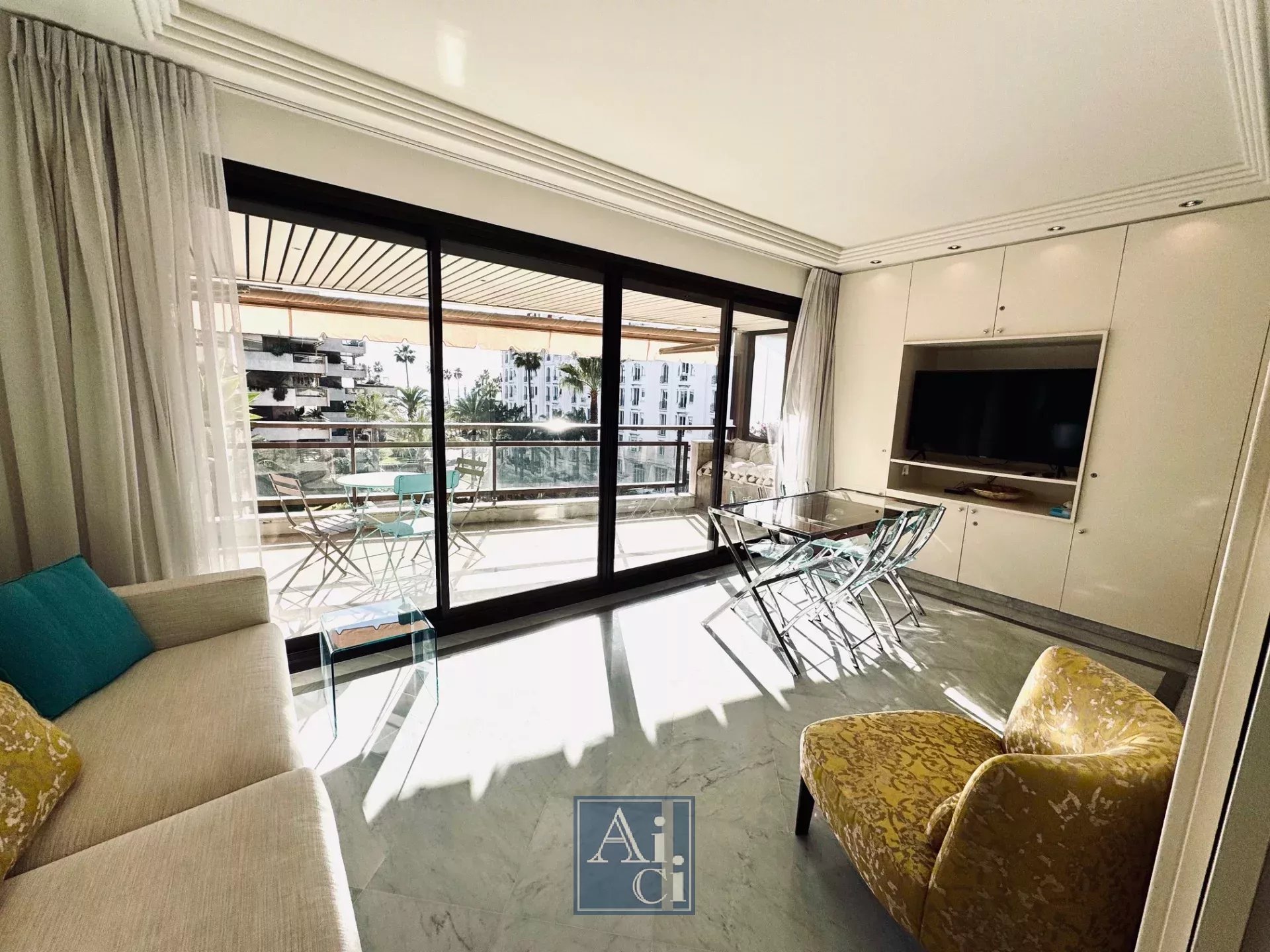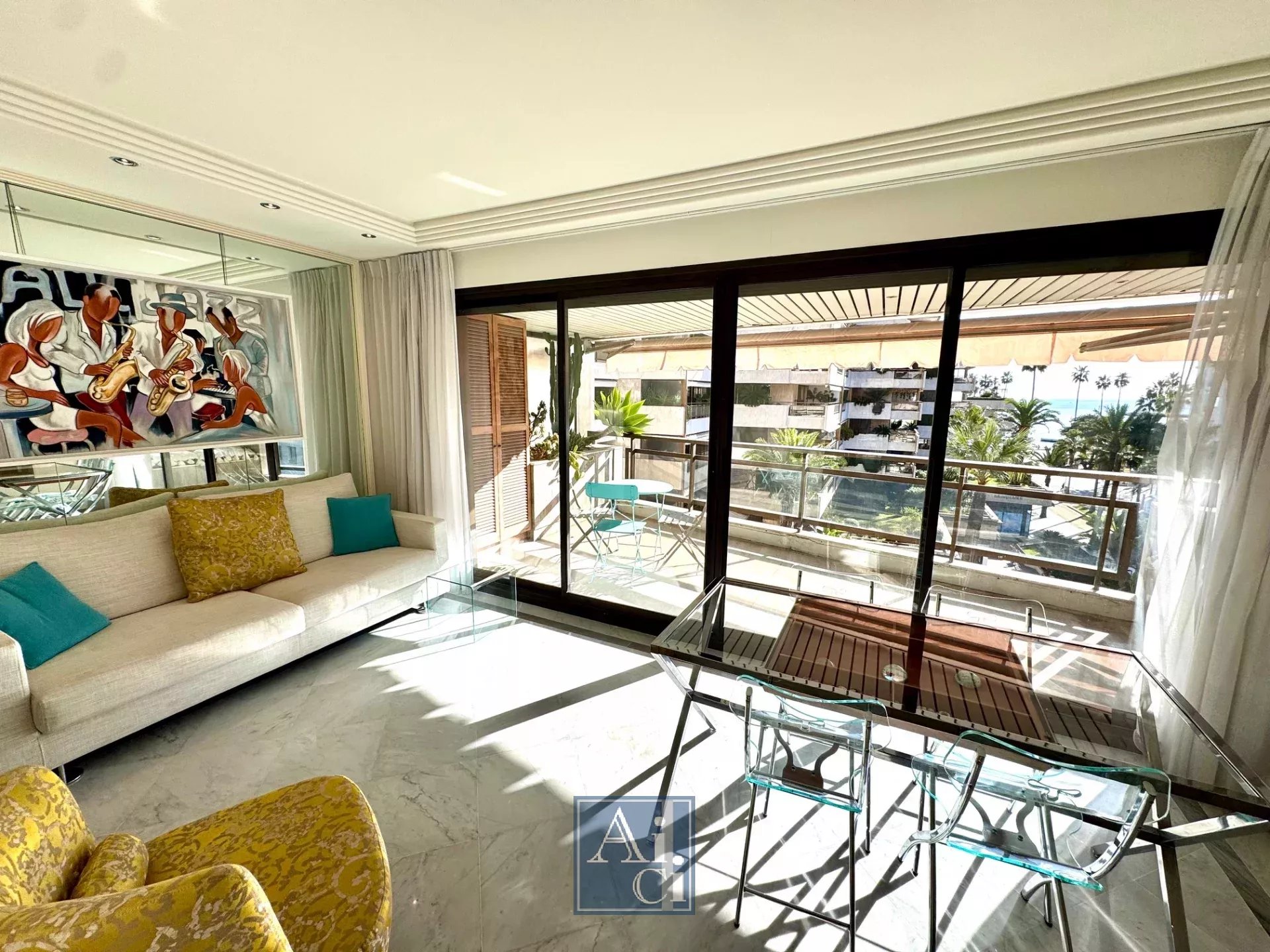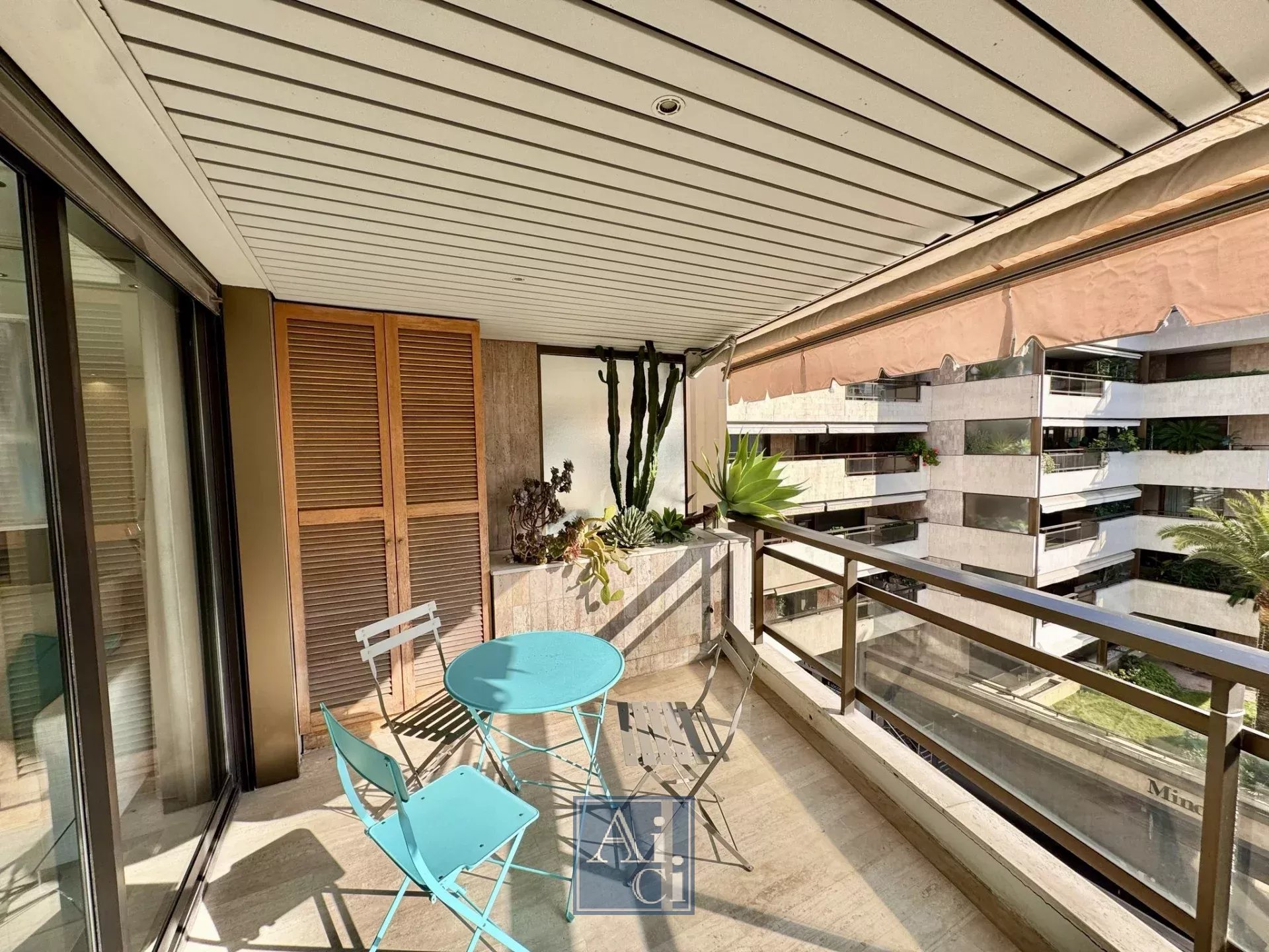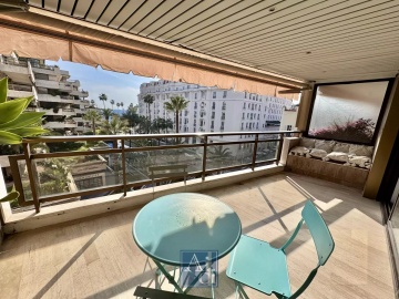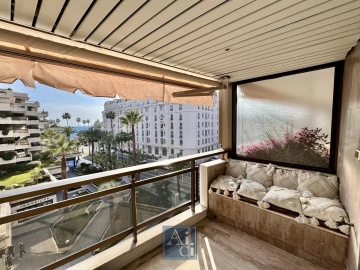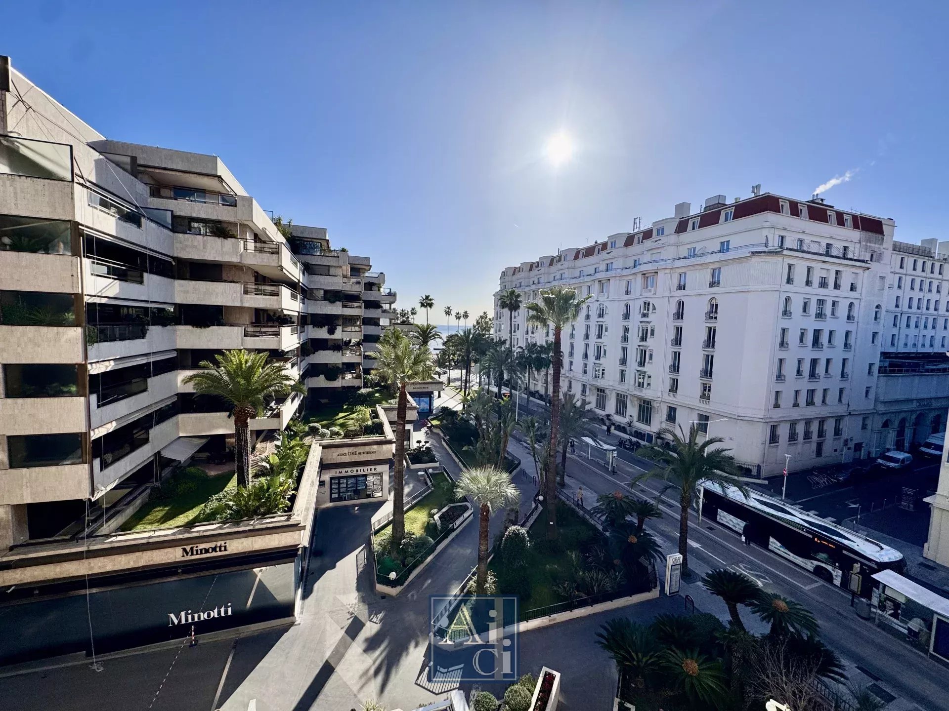 Cannes Gray d'Albion. En étage élevé. Beau 2 pièces avec terrasse vue mer. Entrée, séjour ouvrant sur large terrasse vue mer, cuisine américaine équipée, chambre avec lit double, salle de douche avec toilette. Climatisation. Wifi.