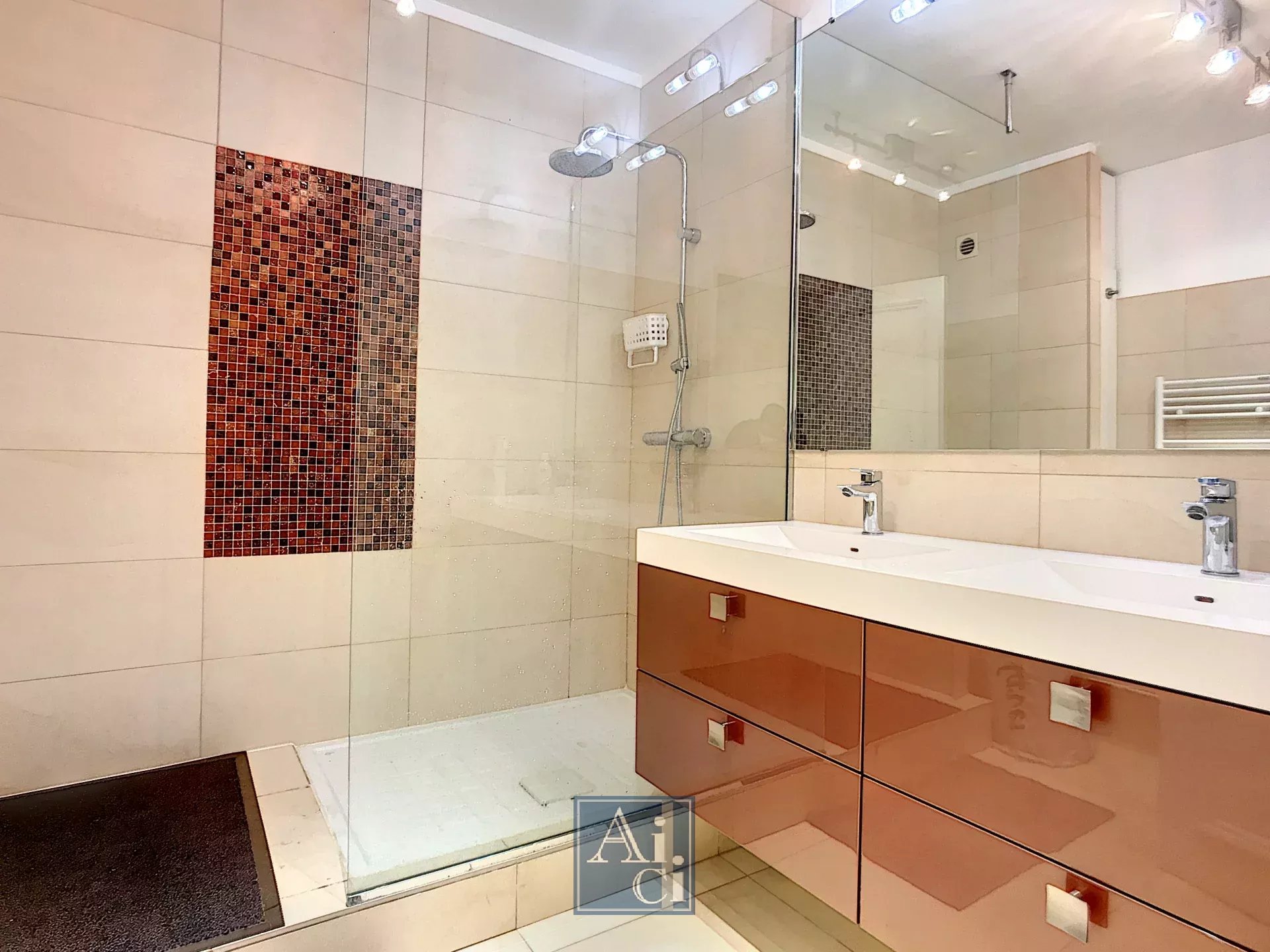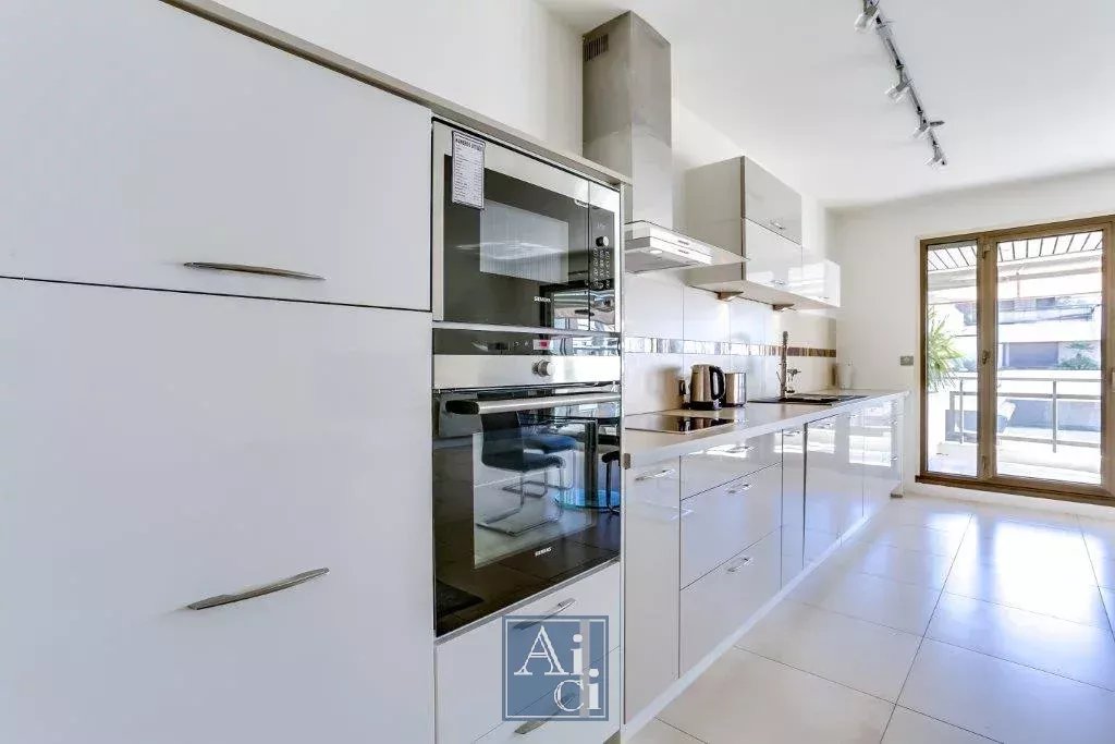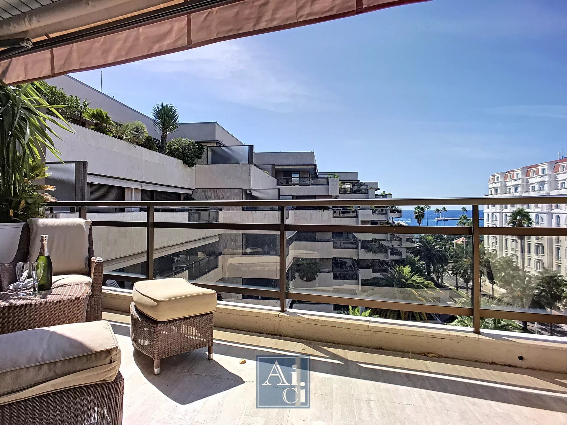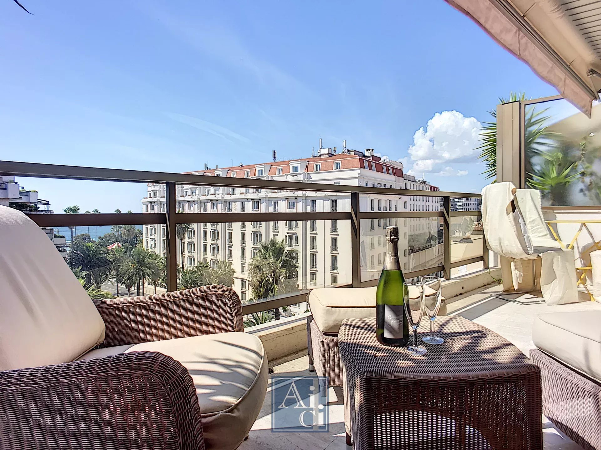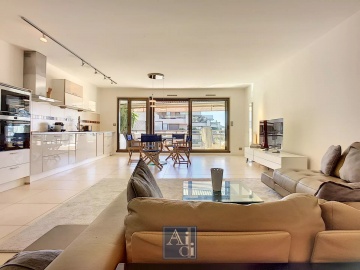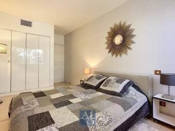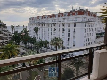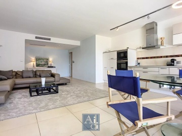 Cannes Résidence du Gray d'Albion. En avant dernier étage. Grand 2 pièces de 80m². entrée avec toilettes invités, séjour de 40m² ouvrant sur terrasse vue mer, cuisine américaine entièrement équipée, chambre avec lit double, salle de douche avec toilettes. Climatisation. Wifi.