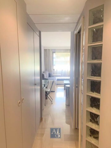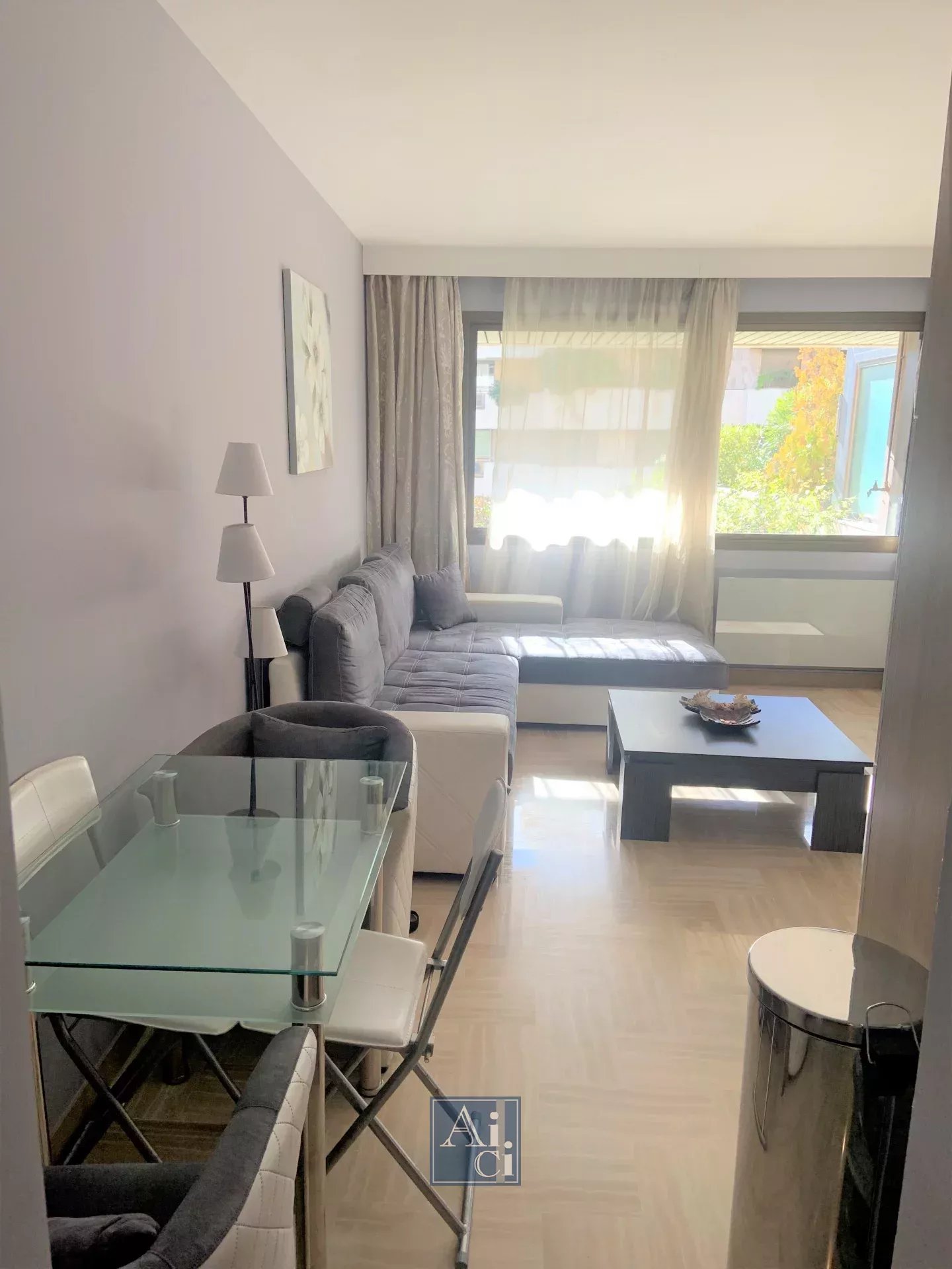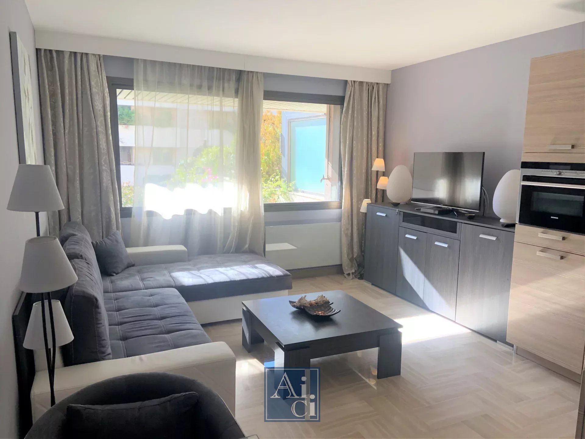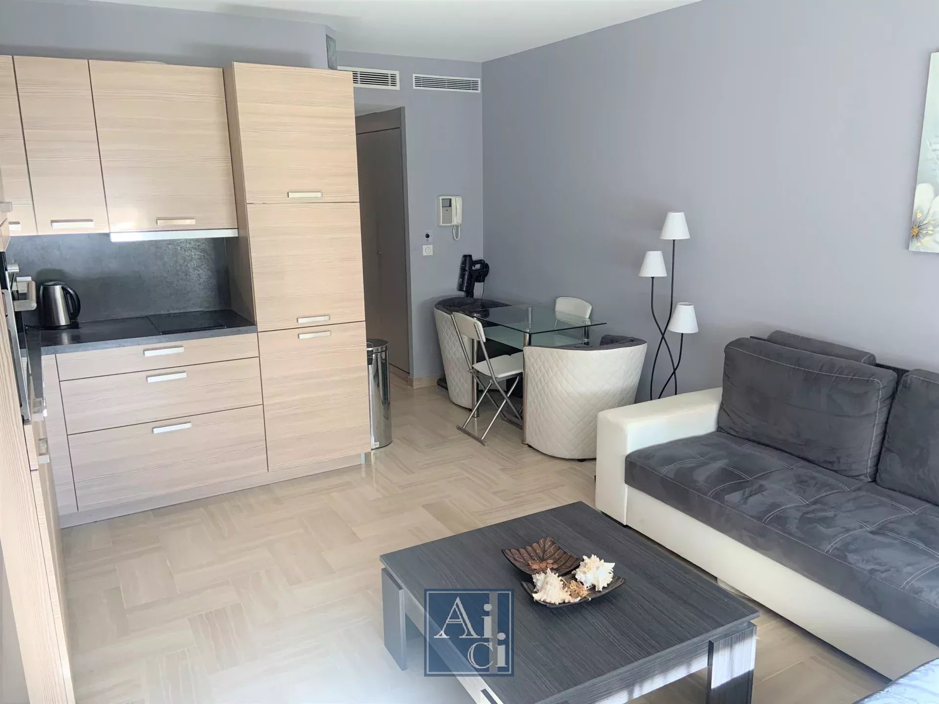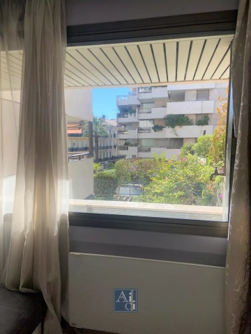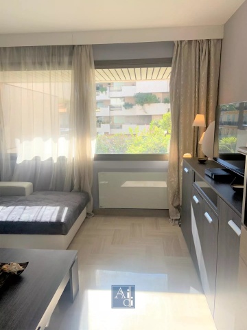 Cannes Banane à 300m du Palais des Festivals. Dans la prestigieuse résidence du Gray d'Albion. Beau 2 pièces rénové. Entrée, séjour avec cuisine américaine entièrement équipée, chambre avec lit double, salle de douche avec toilettes. Climatisation. Wifi. Plein Sud au calme sur les jardins.