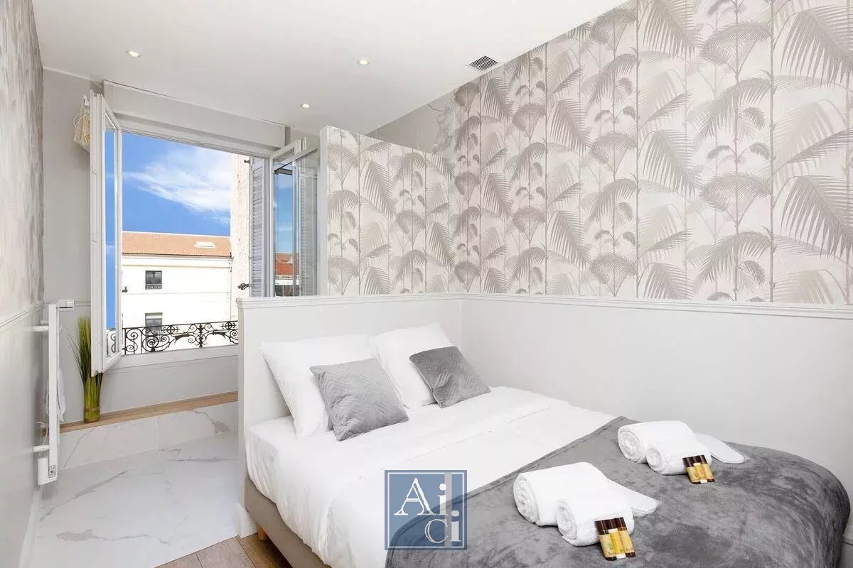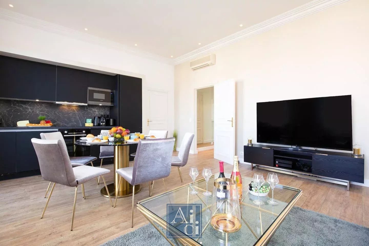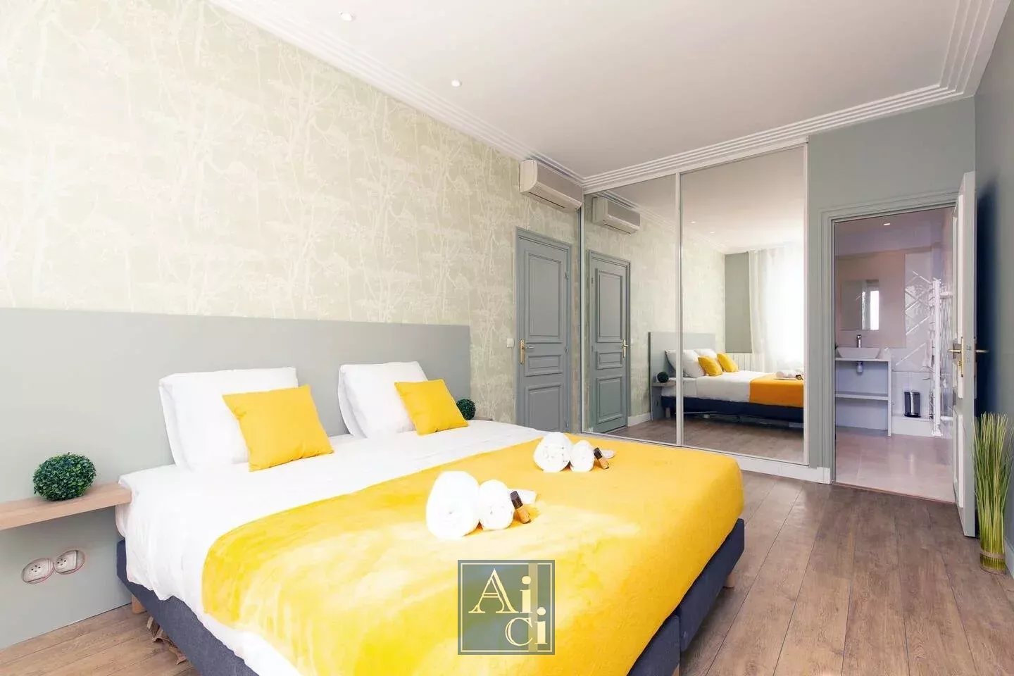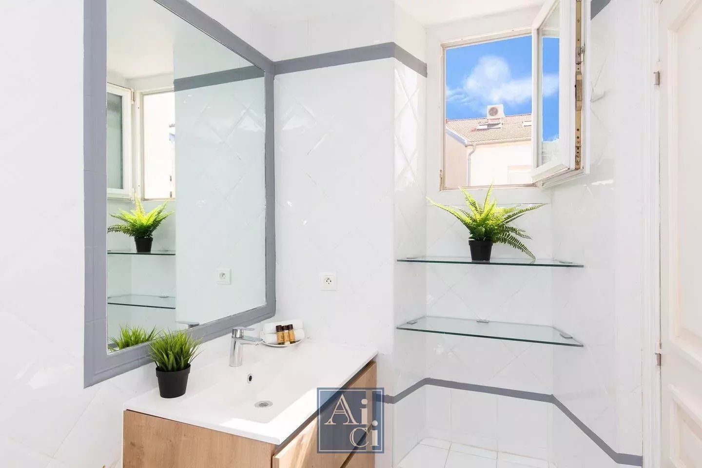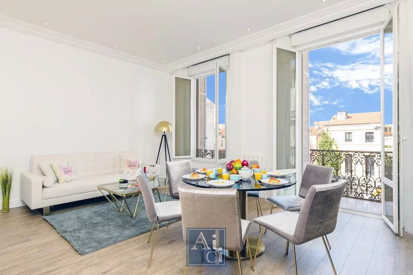 Cannes rue d'Antibes. Dans un bel immeuble bourgeois avec ascenseur. Appartement de 4 pièces meublé neuf. Entrée avec toilettes indépendants, séjour ouvrant sur balcon, cuisine américaine entièrement équipée, chambre de Maître avec salle de bains attenante, 2 chambres avec 2 salles de douches attenantes. Climatisation. Wifi.