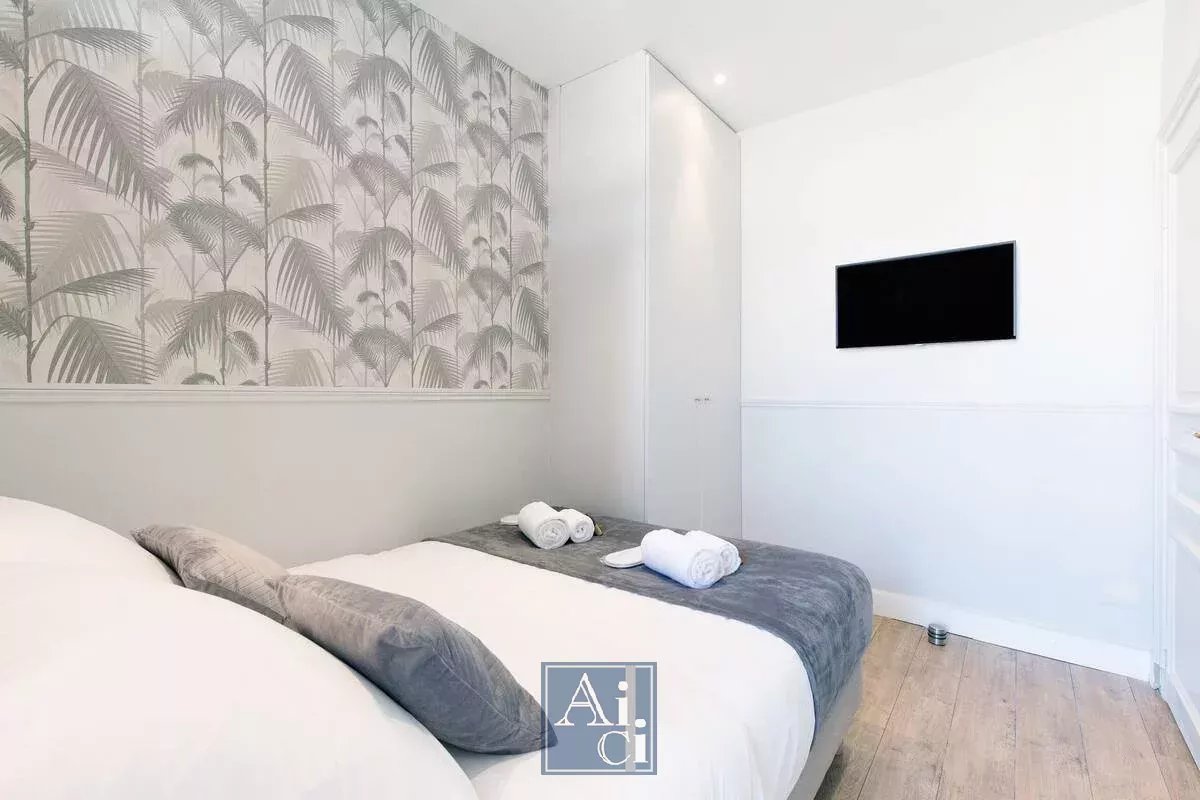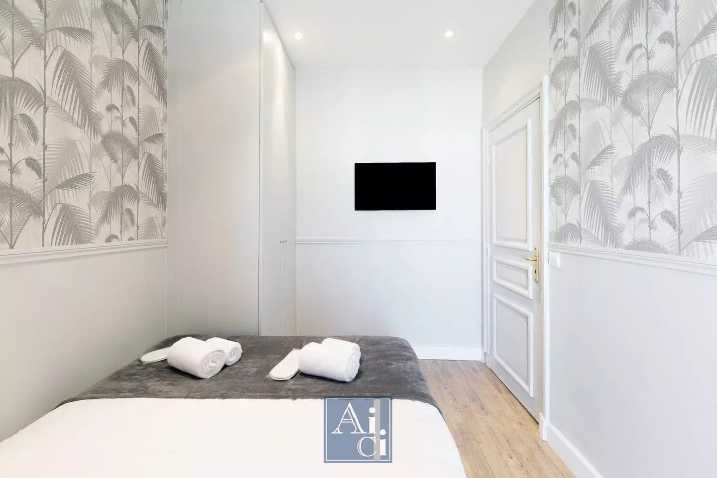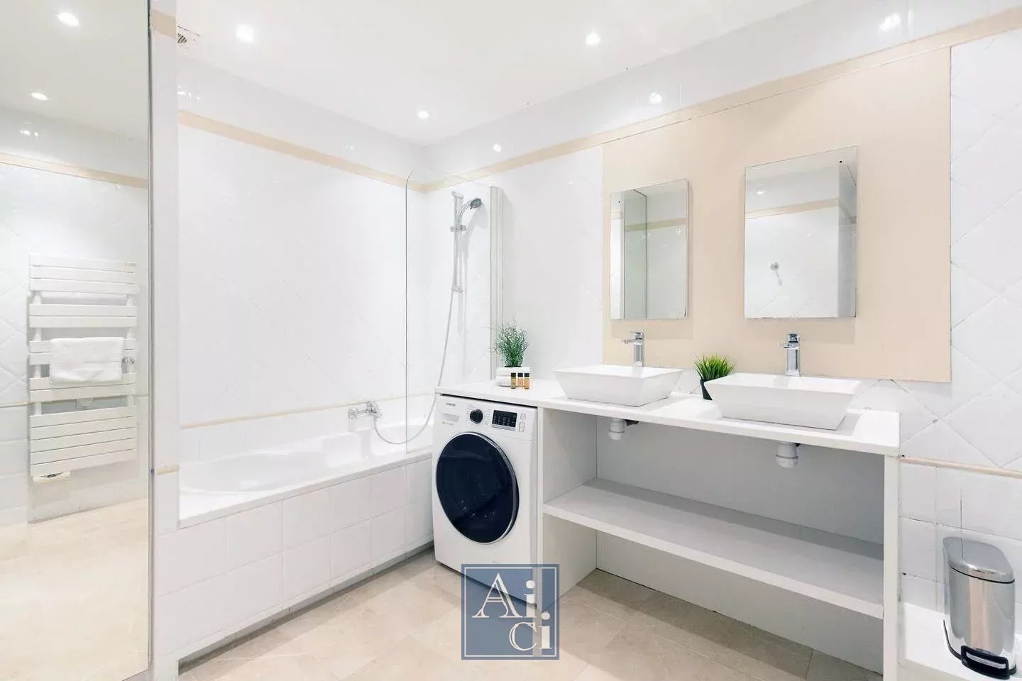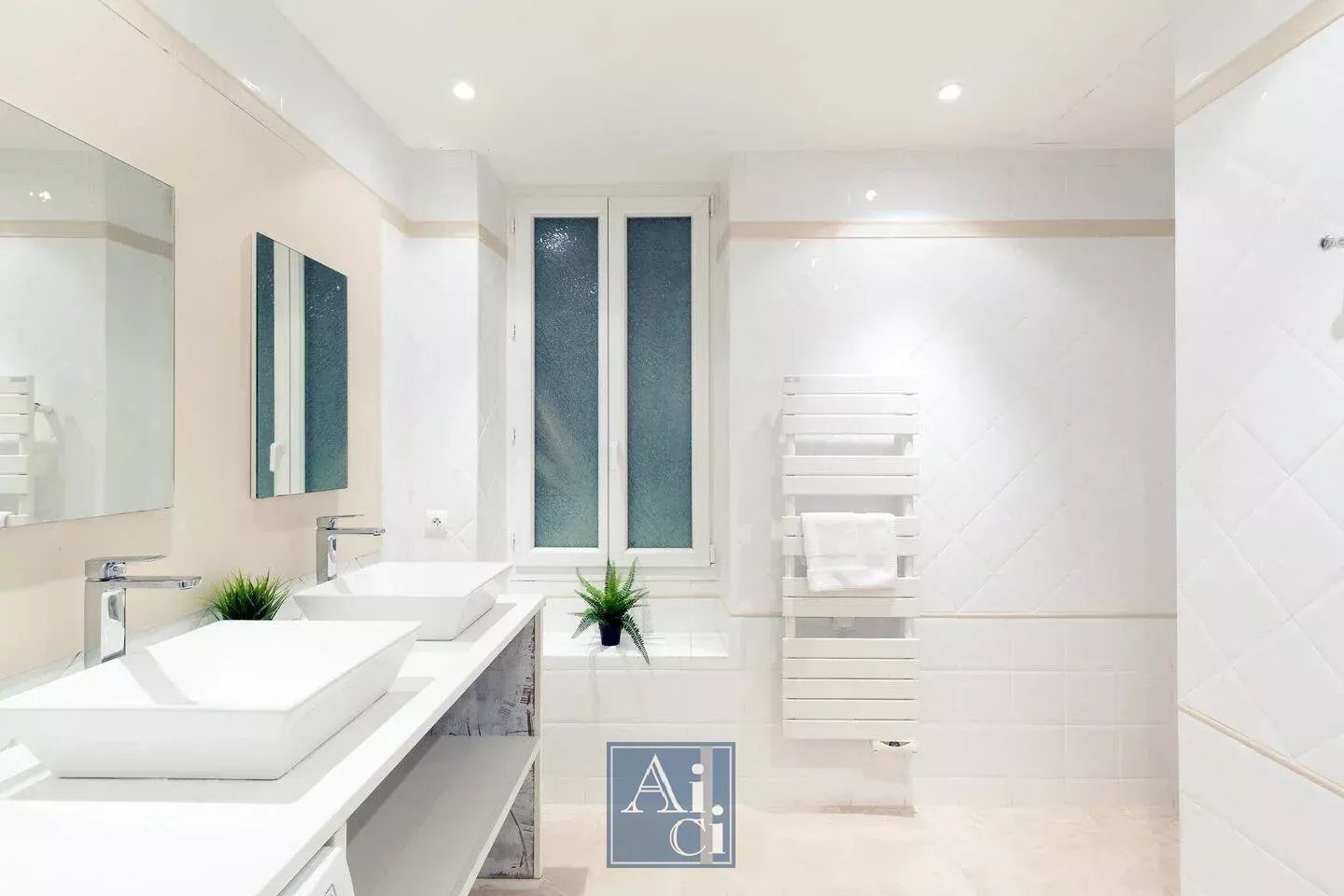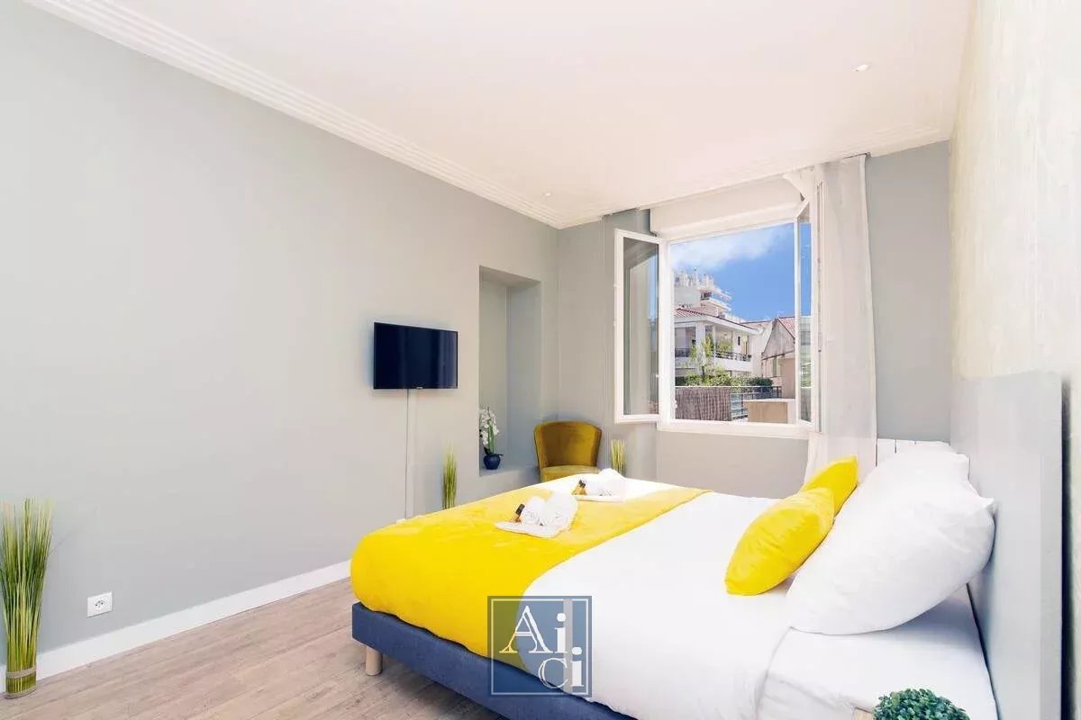 Cannes rue d'Antibes. Dans un bel immeuble bourgeois avec ascenseur. Appartement de 4 pièces meublé neuf. Entrée avec toilettes indépendants, séjour ouvrant sur balcon, cuisine américaine entièrement équipée, chambre de Maître avec salle de bains attenante, 2 chambres avec 2 salles de douches attenantes. Climatisation. Wifi.