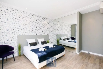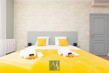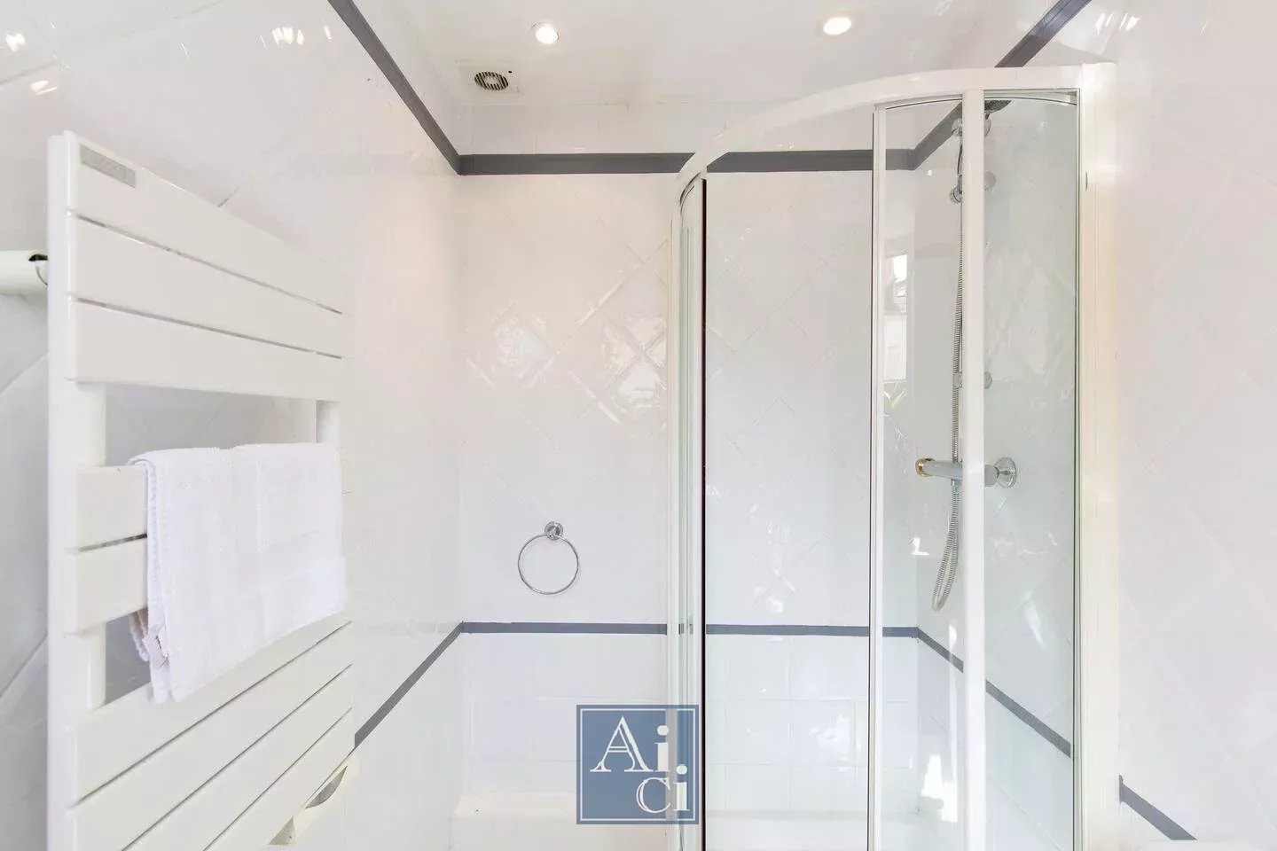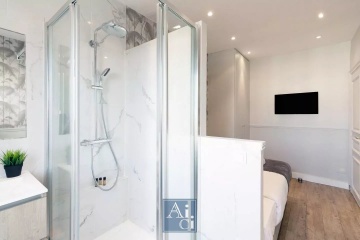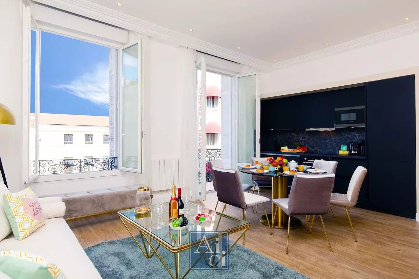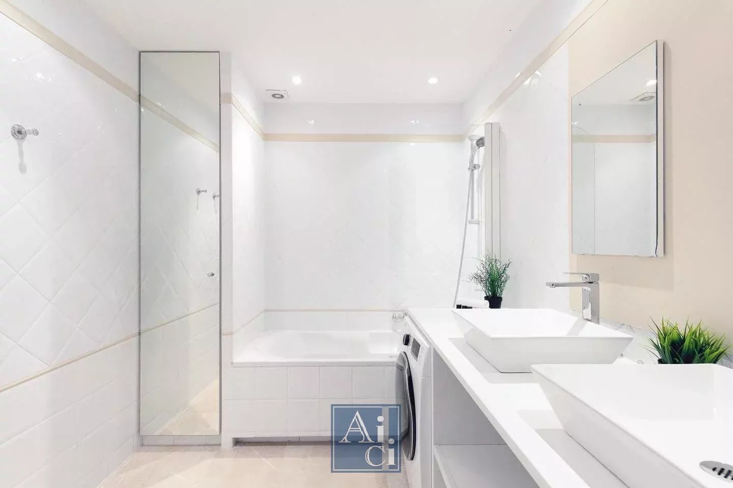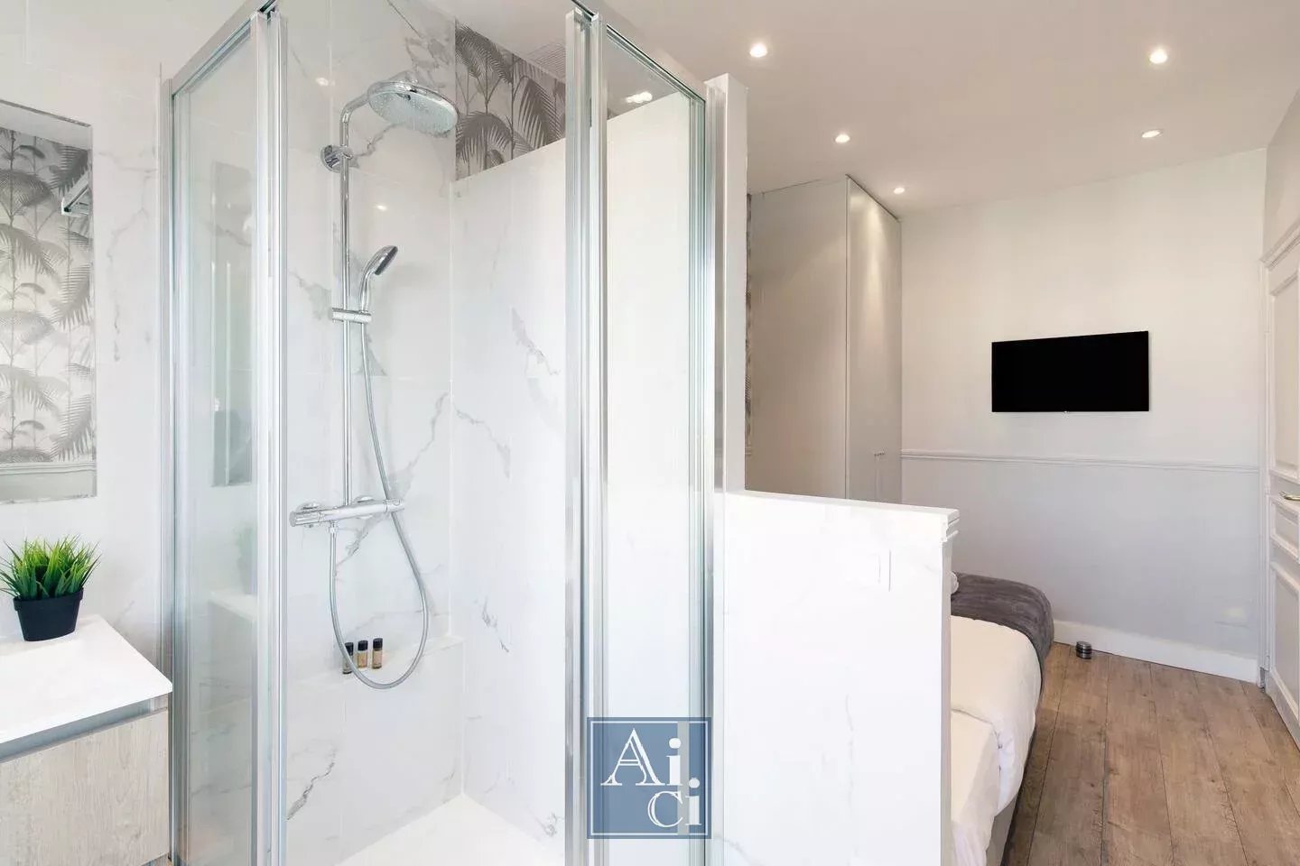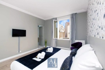 Cannes rue d'Antibes. Dans un bel immeuble bourgeois avec ascenseur. Appartement de 4 pièces meublé neuf. Entrée avec toilettes indépendants, séjour ouvrant sur balcon, cuisine américaine entièrement équipée, chambre de Maître avec salle de bains attenante, 2 chambres avec 2 salles de douches attenantes. Climatisation. Wifi.
