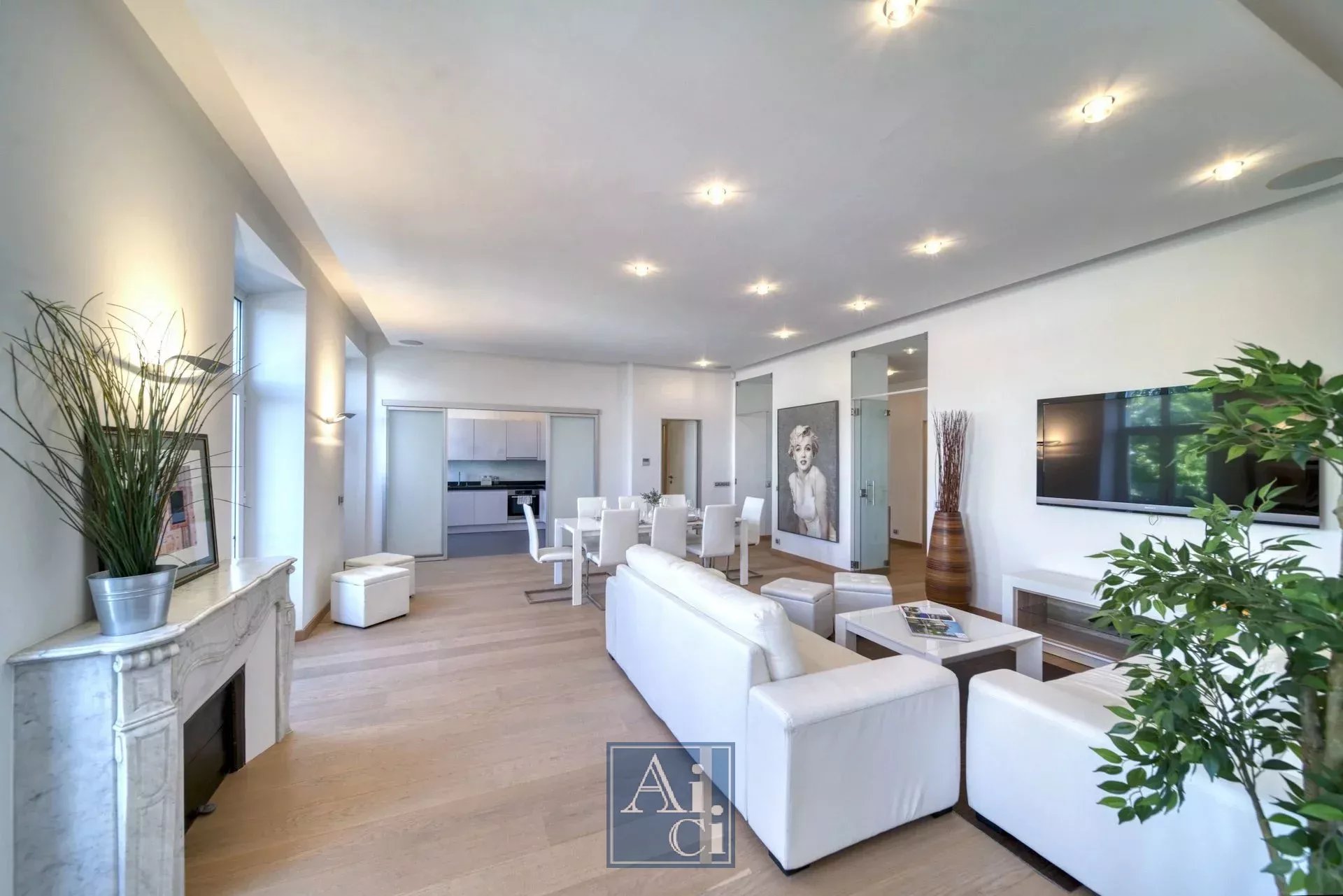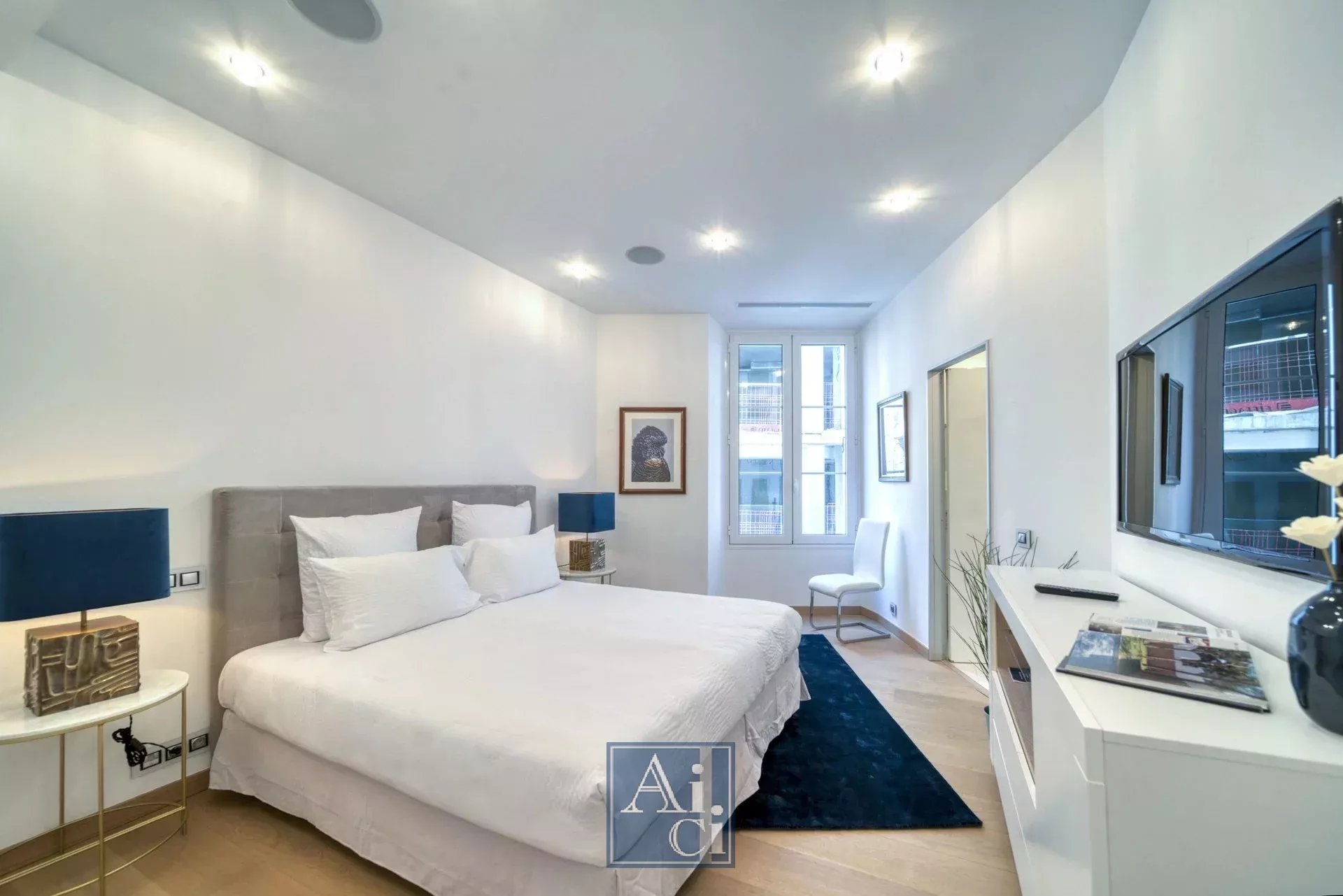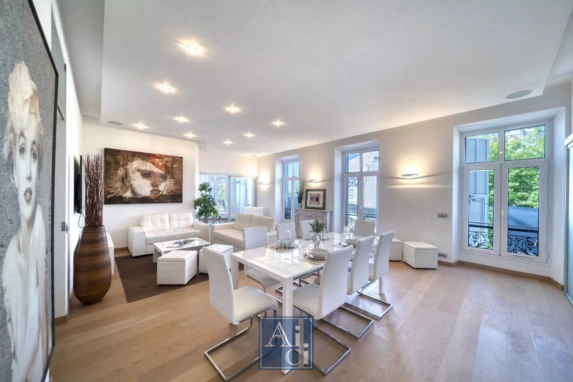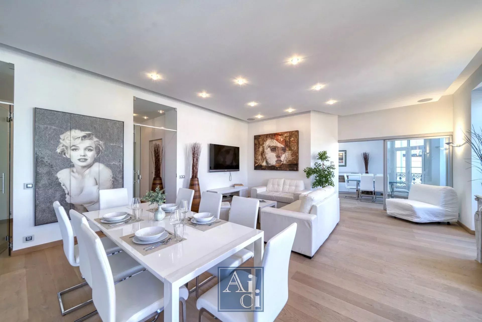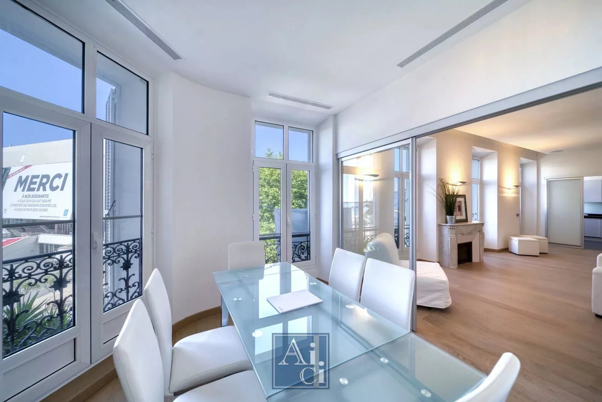 Cannes Croisette face au Palais des Festivals. Grand 4 pièces de 140m² entièrement rénové. Entrée avec toilettes invités, double séjour, belle cuisine semi-américaine. 3 chambres avec 3 salles de bains en suite. Climatisation. Idéal bureaux.