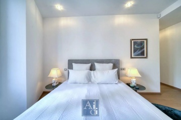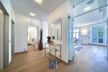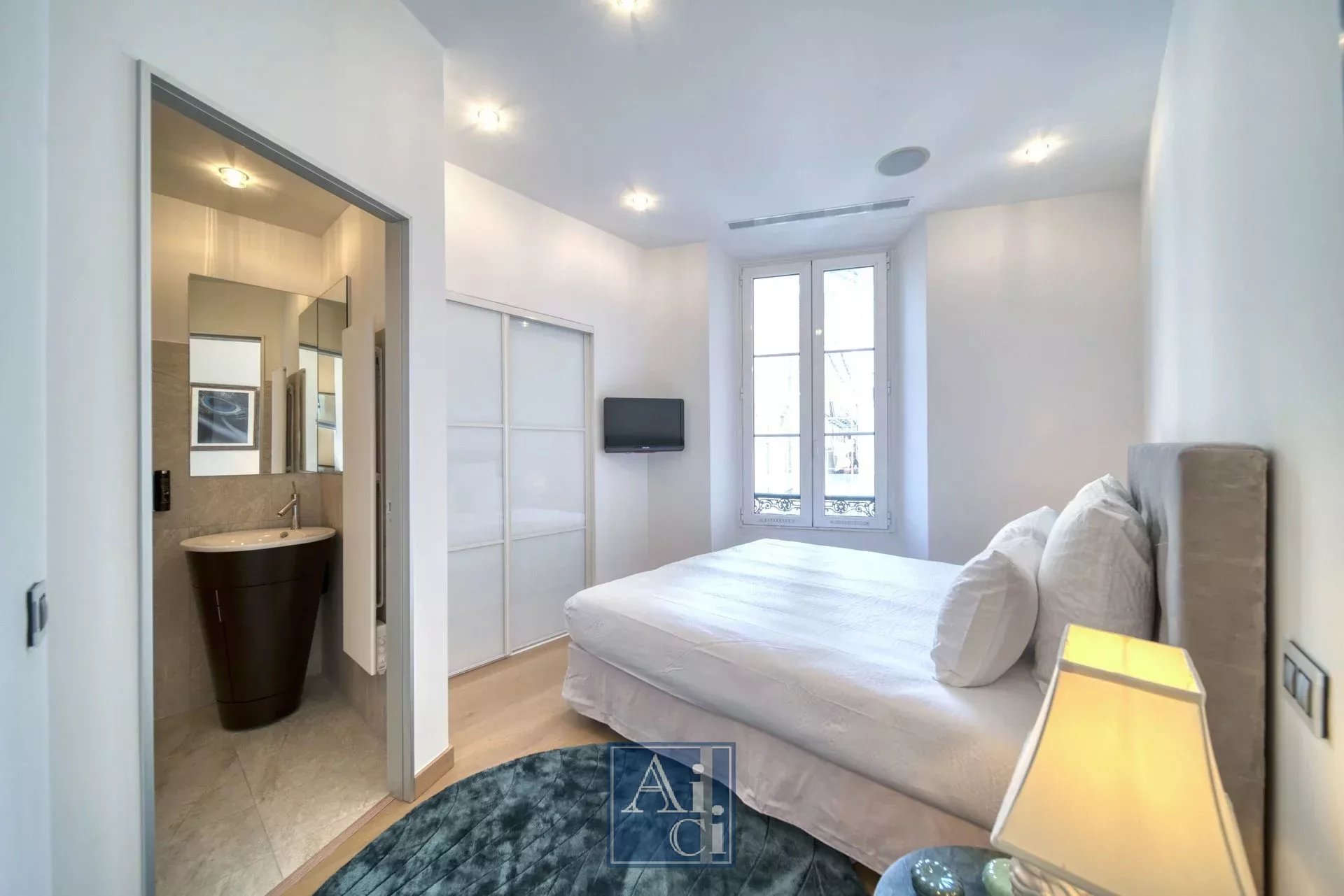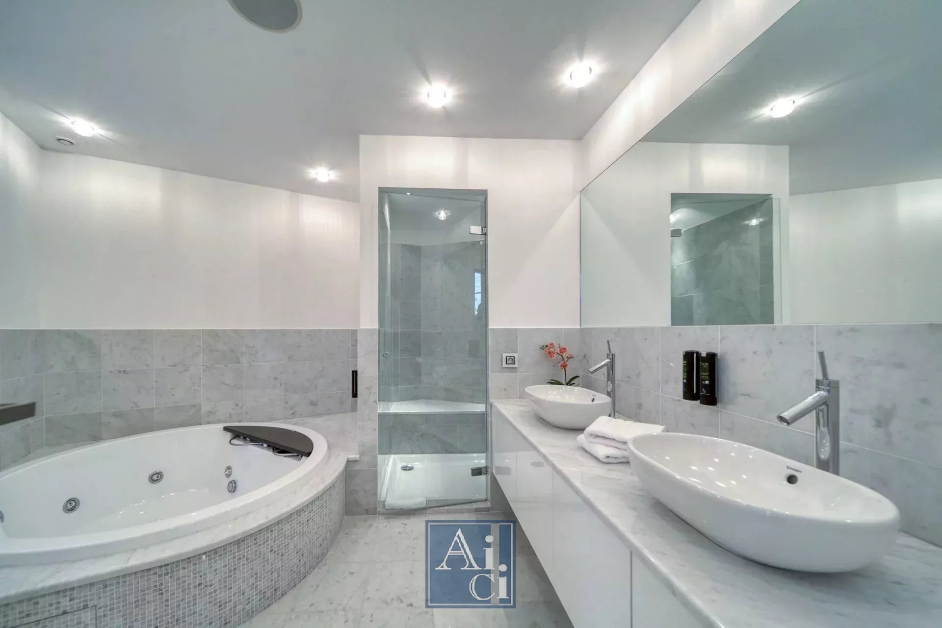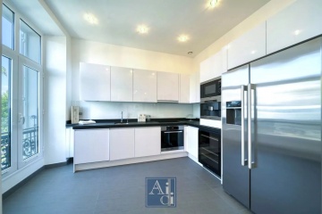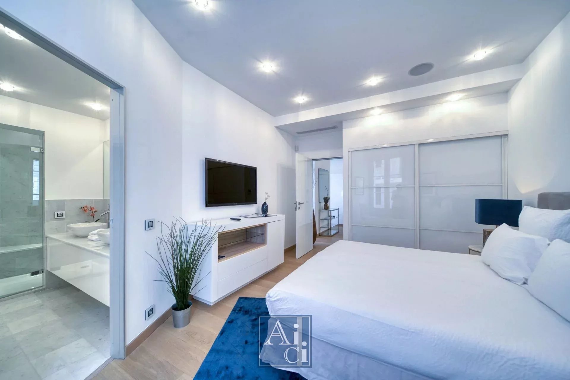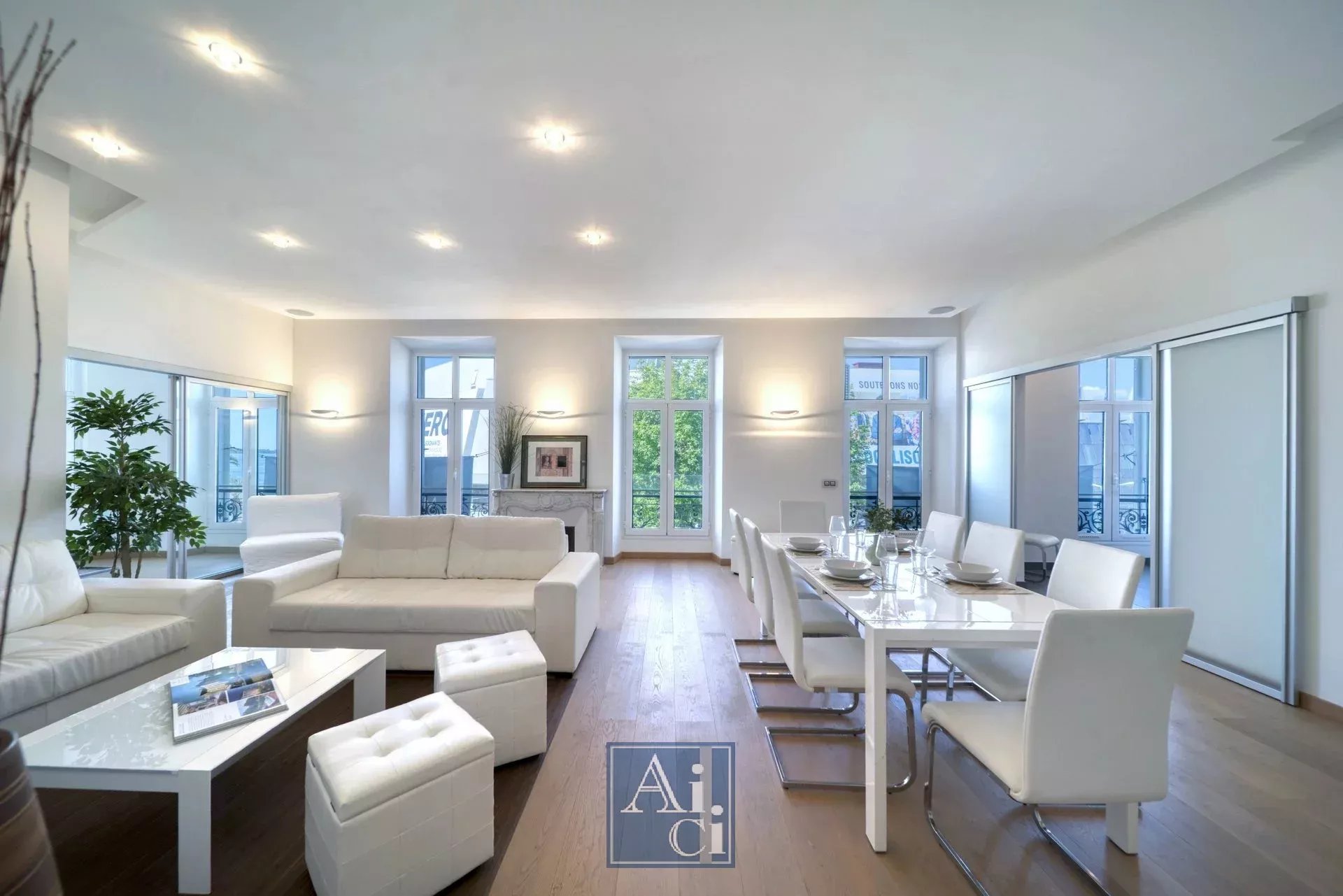 Cannes Croisette face au Palais des Festivals. Grand 4 pièces de 140m² entièrement rénové. Entrée avec toilettes invités, double séjour, belle cuisine semi-américaine. 3 chambres avec 3 salles de bains en suite. Climatisation. Idéal bureaux.